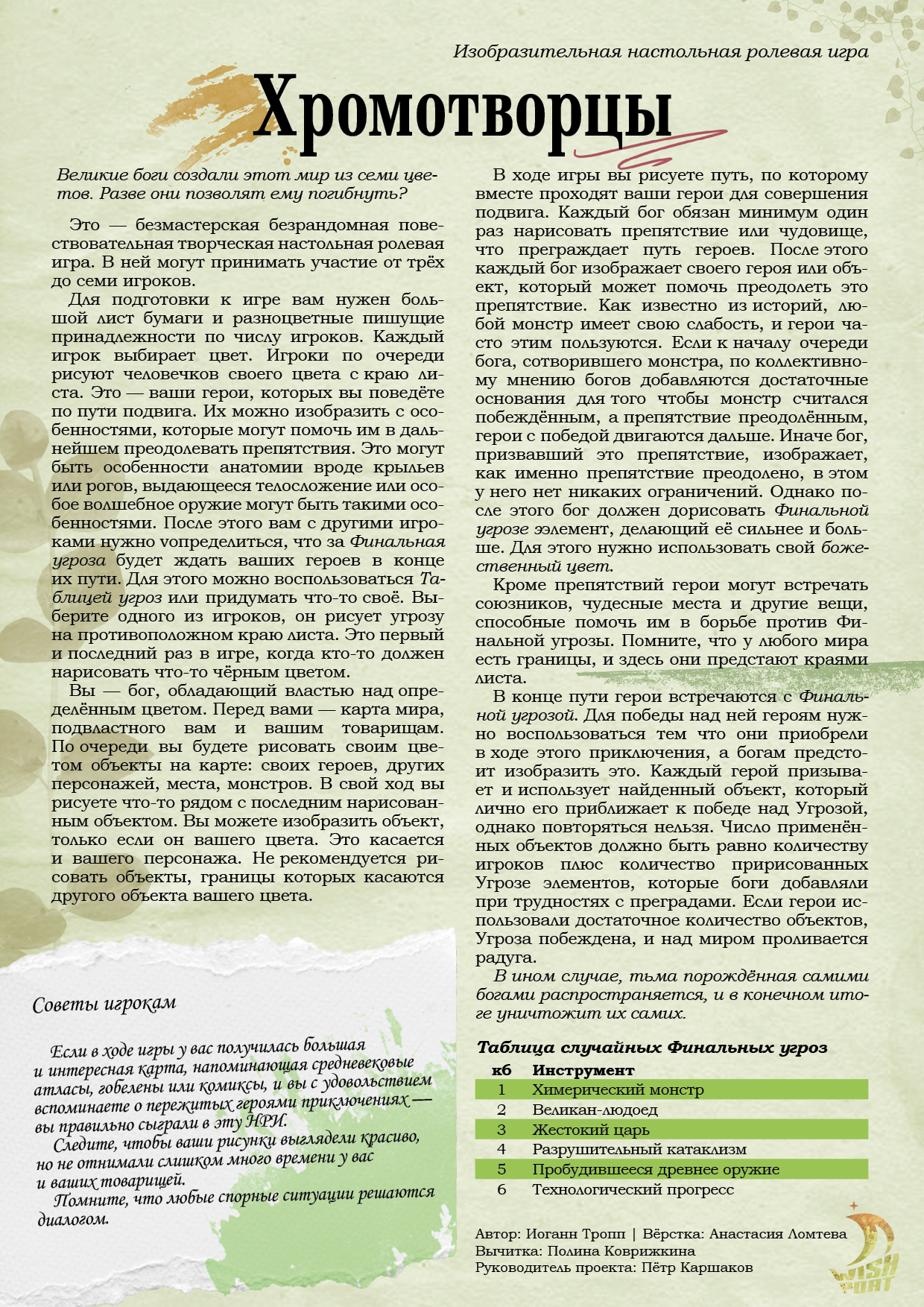 🌈 Вы — боги, каждый из которых владеет своим цветом. Вы создаёте героев и ведёте их через чудеса, испытания и сражения с монстрами. Вместо кубиков и ведущего — лишь большой лист бумаги, разноцветные ручки и совместное воображение.